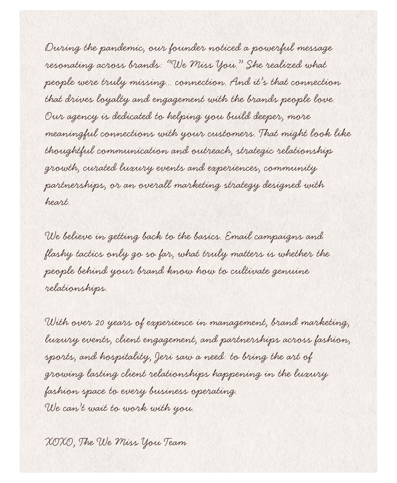 One of our brand symbols is an envelope, a nod to the timeless art of meaningful connection. In an age of automation, we believe in getting back to the basics of authentic client relationships. When was the last time you wrote a handwritten note to a customer? We’re here to help you craft thoughtful, heartfelt messages—your brand’s own love letters—to the people who matter most.